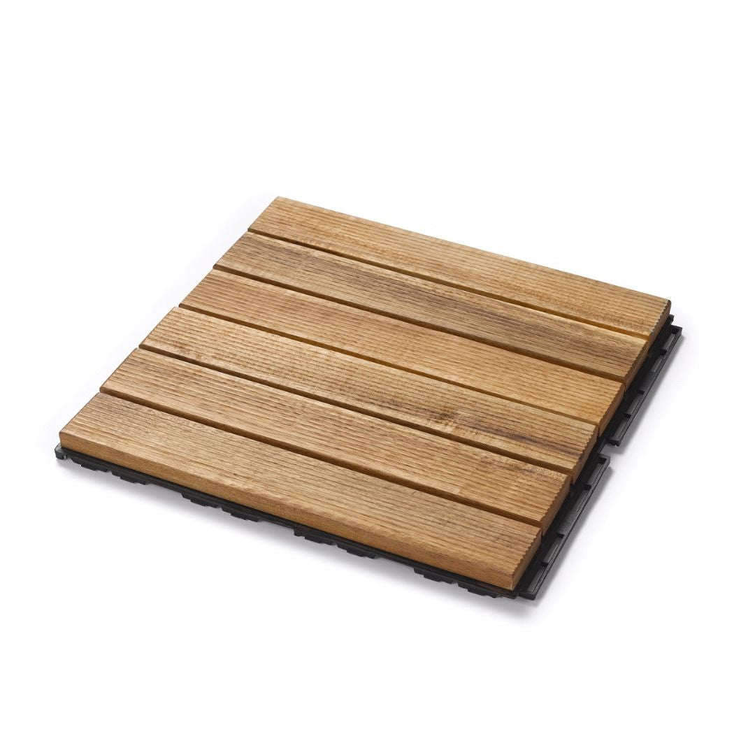 Unsere iWerk® Bodenfliesen aus Thermo-Esche sind die ideale Lösung für alle, die ihren Außenbereich hochwertig und langlebig gestalten möchten. Das eingesetzte Holz wird thermisch behandelt und weist dadurch ein besonders geringes Quell- und Schwindverhalten auf – es nimmt kaum Wasser auf und bleibt formstabil. So sind die Fliesen bestens als Terrassenfliesen, Balkonfliese oder Garten-Bodenbelag geeignet.