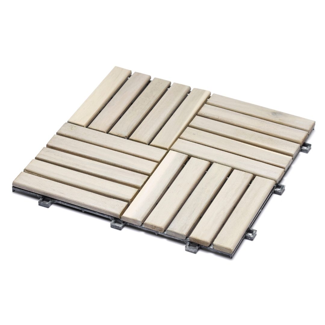 Die Holzfliesen verfügen über eine stabile Unterkonstruktion aus wetterfesten Kunststoffstreben, die eine direkte Verlegung auf ebenem, festem Untergrund (z. B. auf dem Balkon) ermöglichen – ohne zusätzliche Unterkonstruktion.